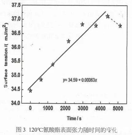 從圖3中,我們可以看到含固化劑的氰酸酯樹(shù)脂體系在恒溫溫度120℃下表面張力變化關(guān)系為線(xiàn)性增加段和表面張力突降段。