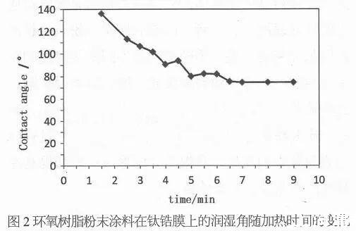 這說(shuō)明環(huán)氧樹(shù)脂粉末涂料對(duì)鈦鋯膜的潤(rùn)濕性良好,能夠自發(fā)地在涂層表面進(jìn)行鋪展,且涂層具有良好的附著力。