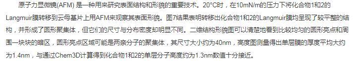 合成了雙頭基多氟烷基兩親杯芳烴化合物1和2,并對該化合物在空氣/水相界面的成膜性能進行了研究,利用表面壓一面積(π-A)等溫線、壓縮/擴張循環等溫線與膜穩曲線,紫外光譜和原子力顯微鏡對組裝的LB膜進行了結構表征,表明化合物1和2在空氣/水相表面均能很好的形成穩定的Langmuir膜,取代基碳原子數的增加使得化合物2的Langmuir膜單分子面積增加,崩潰壓相應減少,組裝的LB膜均為H-聚集體,結構均勻,穩定性好。