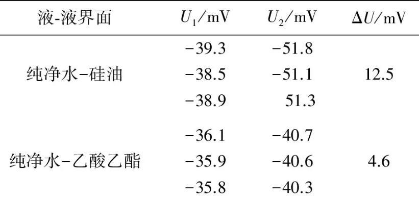 實驗測量所用金屬吊環(huán)的外徑、內(nèi)徑分別為0.034 96 m和0.033 10 m.在20℃實驗條件下,采用自制2種液體間界面張力的動態(tài)實時測量儀,測量了純凈水-硅油和純凈水-乙酸乙酯間的界面張力.測量出金屬吊環(huán)由液體I中完全進入液體Ⅱ的過程中,液體I的液膜被拉斷前電壓的最大值U1,拉斷后趨于穩(wěn)定時的電壓值為U2,數(shù)據(jù)結(jié)果如表1所示。