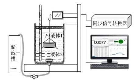圖1為自制2種液體間界面張力的動態(tài)實時測量裝置圖,該儀器主要包括電腦顯示器、同步信號轉(zhuǎn)換器、自制實驗架臺、力敏傳感器、金屬吊環(huán)、恒溫杯、溫度計、排液孔、排液管、流速調(diào)節(jié)器和儲液槽等組成.