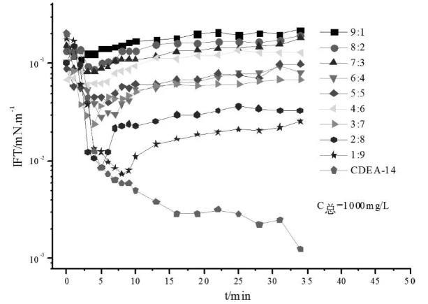 圖1總濃度為1000mg/L CDEA-12和CDEA-14不同復配比例油水動態界面張力關系