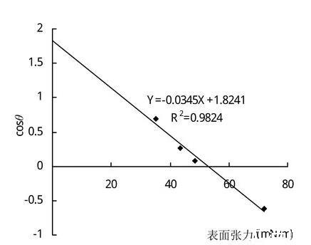 參照Zisman作圖法,選取潔凈、無病斑的劍麻葉片,用刀片切成規(guī)則平整的小塊(避開葉脈),用膠水將其固定在載玻片上,使用微量注射器分別吸取2μL已知表面張力的液體(乙二醇、DMSO、DMF和去離子水),點滴在劍麻葉片表面,置于接觸角測量儀上,記錄此時液滴所成的接觸角θ,每個處理重復10次,取平均值。以這4種液體的表面張力值為橫坐標,cosθ為縱坐標,得到一條直線回歸方程,在cosθ=1(接觸角為0)處得到相應的表面張力值即為劍麻葉片的臨界表面張力值。