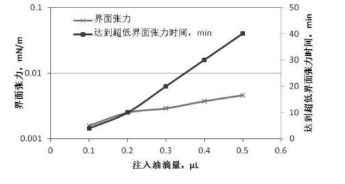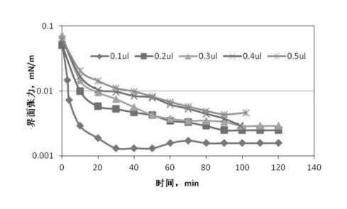 圖3、圖4是根據前述實驗步驟1、2提供的配置與測量方法,油滴注入量分別為0.1μL、0.2μL、0.3μL、0.4μL、0.5μL,無堿二元驅配方體系與高凝油間界面張力的關系曲線。從圖2可知:無堿二元驅配方體系與高凝油間的界面張力達到超低界面張力的時間隨著油滴注入量的增多明顯延長,注入油滴0.1μL,4分鐘達到超低界面張力,注入油滴0.5μL,40分鐘達到超低界面張力;從圖4可知:注入油滴量大于0.3μL以后,對無堿二元驅配方體系與高凝油間界面張力的測定不能持續(xù)2小時,油滴在100分鐘發(fā)生斷開,對于高凝油而言,油滴注入量小于0.3μL較適合。