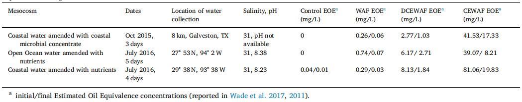 海水是從墨西哥灣收集的,用于填充 12 罐,每個(gè) 130 L,其中 4 個(gè)處理一式三份: 對(duì)照(海水)、WAF(用 Macondo 替代油,一種輕質(zhì)低硫原油,化學(xué)性質(zhì)類似于 在深水期間從 Macondo 井中溢出的石油 Horizon 事件)、CEWAF(Corexit + oil 比例為 1:20)和 DCEWAF (CEWAF 稀釋十倍)。 仔細(xì)描述了中間宇宙的設(shè)置 在韋德等人。 (2017) 以及準(zhǔn)備 WAF 的程序, CEWAF 和 DCEWAF。 簡而言之,注入油或油 + Corexit 進(jìn)入帶擋板的再循環(huán)罐并混合約 24 小時(shí),然后將下層 分?jǐn)?shù)(即,避免表面光滑)被添加到各自的 坦克。 有關(guān)中宇宙實(shí)驗(yàn)的信息在表 1 中給出 根據(jù)估計(jì)值添加初始和最終油濃度 根據(jù) Wade 等人確定的油當(dāng)量 (EOE)。 (2011 年,2017 年)。 實(shí)驗(yàn)持續(xù) 3 到 5 天,運(yùn)行 12:12 明暗循環(huán)。 在表 1 中,對(duì)于使用沿海 用微生物濃縮物修正的水域,浮游生物(≥63 μm)是 用網(wǎng)收集并轉(zhuǎn)移到聚碳酸酯瓶中。 這個(gè) 將濃縮的浮游生物塊引入罐中并攪拌(2 L 到每個(gè))在開始實(shí)驗(yàn)之前。 對(duì)于公海水域和沿海水域的中宇宙,營養(yǎng)物質(zhì)進(jìn)行了修正, 添加營養(yǎng)物(最終濃度 f/20)并攪拌罐。